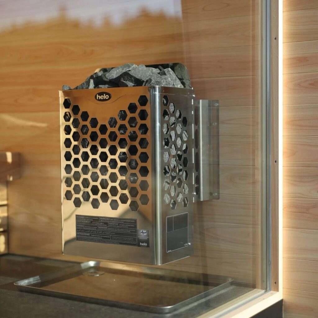 MORI SAUNAの電気ヒーター(helo社)はWi-Fi操作に対応し、スマートフォンから温度設定・タイマー・起動・停止を遠隔でコントロールできます。