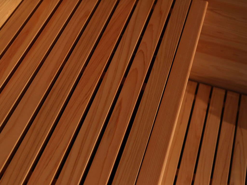 MORI SAUNAの内装に選ばれたのは、国内生産量No.1を誇る岡山県で育った最高グレードの国産ヒノキ。日本のヒノキ産地の中でも特に名高く、建築材としてはもちろん、神社仏閣にも用いられてきた歴史ある材です。美しい木目、柔らかな香り、湿熱に強い特性のすべてが、サウナに最適な素材と言えます。 -